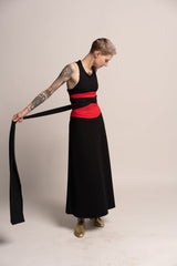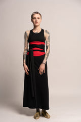 The belt is made of stretchable lycra fabric. The centerpiece is a double layered lycra in order to fit the body shape without losing its structured look.