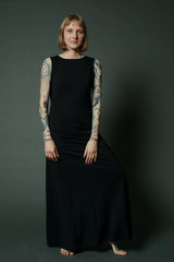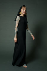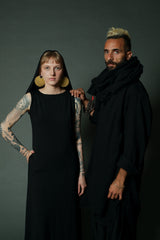 Maxi tribal black dress with pockets and a stunning long hoodie, is timeless. The loose cut is fitting on the bust line and opens into a flare from the waist, making the dress both comfortable and flattering to the body. The boat cut creates a mysterious look. The dress is great for spring and cool summer nights.