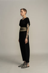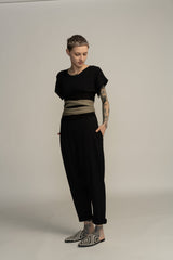 The belt is made of stretchable lycra fabric. The centerpiece is a double layered lycra in order to fit the body shape without losing its structured look.